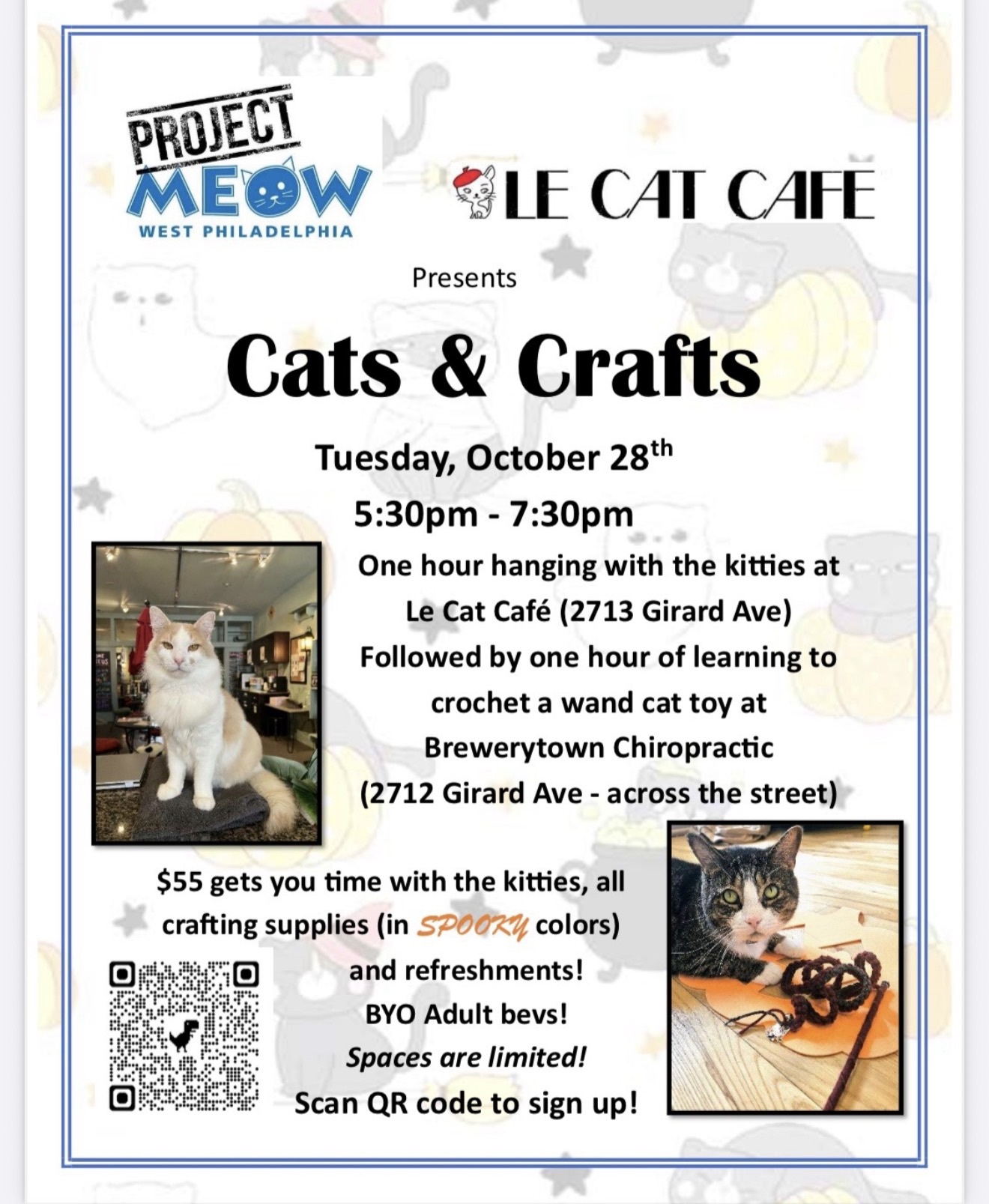 First hour is spending time at Le Cat Cafe with the cats and the second hour will be across the street at Brewerytown Chiropractic learning to crochet. We will make a crocheted cat toy. All supplies will be included. Snacks and beverages will be provided. All proceeds go to support Project Meow and Le Cat Cafe!